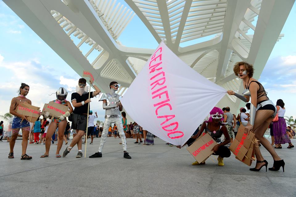 O mesmo questionamento é levantado pelo coletivo Seus Putos, que apresenta o registro de uma intervenção realizada na inauguração do Museu do Amanhã, também na Zona Portuária, como parte do projeto de revitalização. Num país que tem sua história recalcada, onde museus e bibliotecas são fechados por falta de investimento – ou ainda incendiados, como o recente caso do Museu Nacional – é realizado um projeto milionário cujo nome guarda ecos do “País do Futuro”, como afirma Benjamin Moser. O coletivo Seus Putos, com seus trajes futuristas e seus “corpos estranhos”, levantam placas e uma bandeira com a palavra “gentrificado”, denunciando o processo que levou à remoção de pessoas empobrecidas daquela região e questionando os reais propósitos da construção do museu.