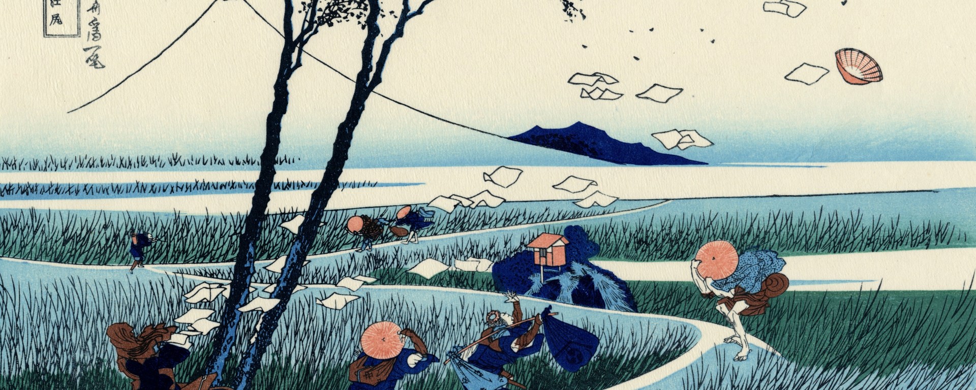 Hokusai é um importante nome da arte japonesa do século XIX e grande exemplo de artista que lida com a apreensão do efêmero. A grande onda de Kanagawa (c. 1829-1833), talvez sua obra mais conhecida, revela sua perícia em captar um momento instantâneo. A mesma habilidade é demonstrada em Viajantes surpreendidos por um vento súbito em Ejiri (c. 1832), que faz parte da mesma série, Trinta e seis vistas do Monte Fuji. A paisagem e as cenas do cotidiano eram temas comuns na arte japonesa do século XIX e Hokusai cria nessa gravura uma mistura desses dois gêneros em uma composição que valoriza o movimento e o ritmo, garantidos pela gradação de tamanho das figuras, que cria também uma ilusão de profundidade. Além de captar um instante, Hokusai lida com a subjetivação do espaço, que pode ser percebida nos diferentes tratamentos que dá ao Monte Fuji e a todo o cenário ao seu redor em diferentes obras da série.