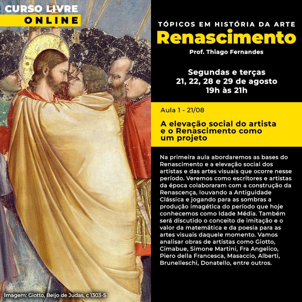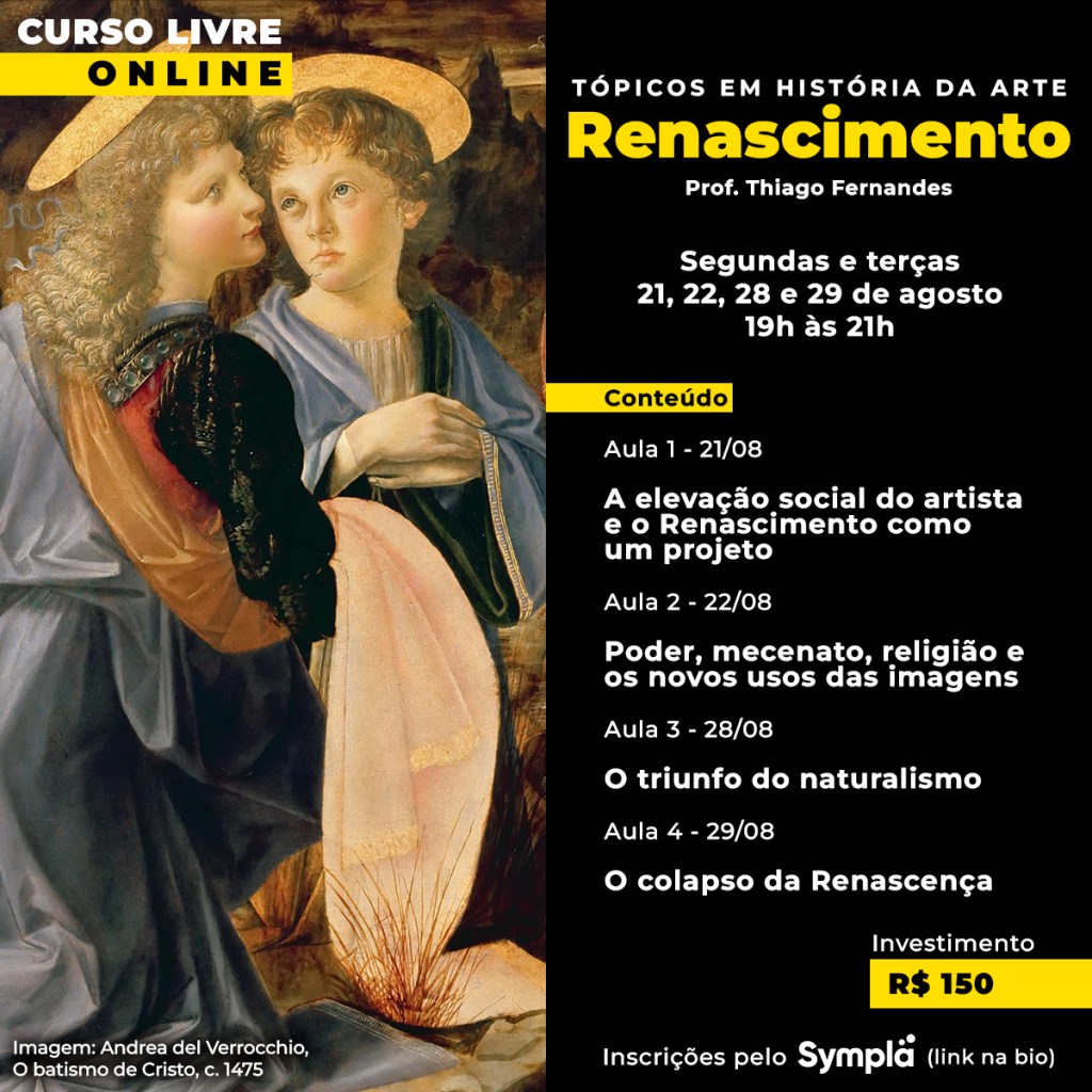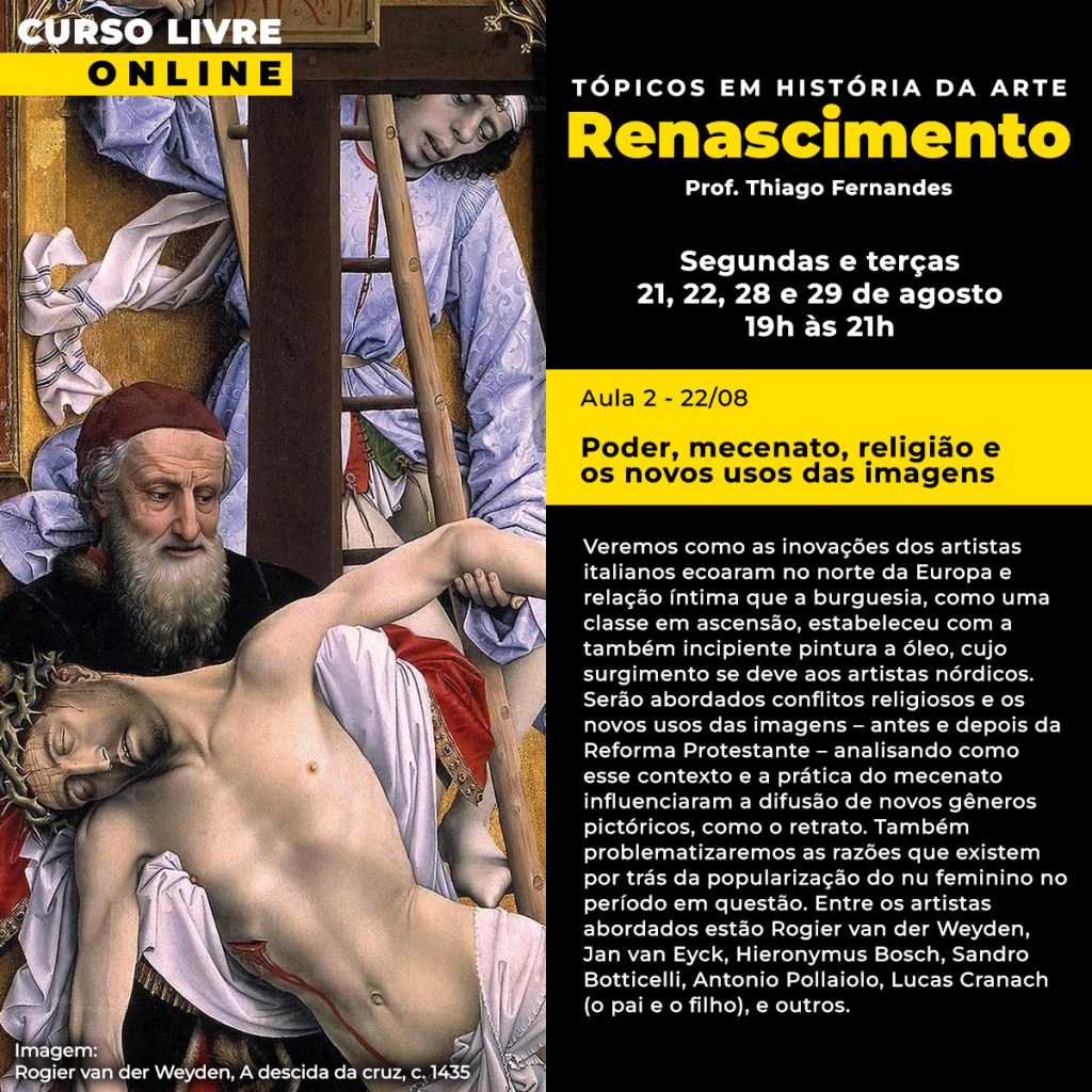 Aprofunde-se em um dos períodos mais fascinantes da história da arte ocidental. O curso apresentará alguns dos principais artistas do Renascimento, acompanhados por análises de suas obras, relacionando as transformações que ocorrem no campo da arte com o contexto social, político e religioso da época. Em 4 encontros online pela plataforma Zoom, com 2 horas de duração, vamos percorrer tópicos fundamentais para a compreensão desse período.