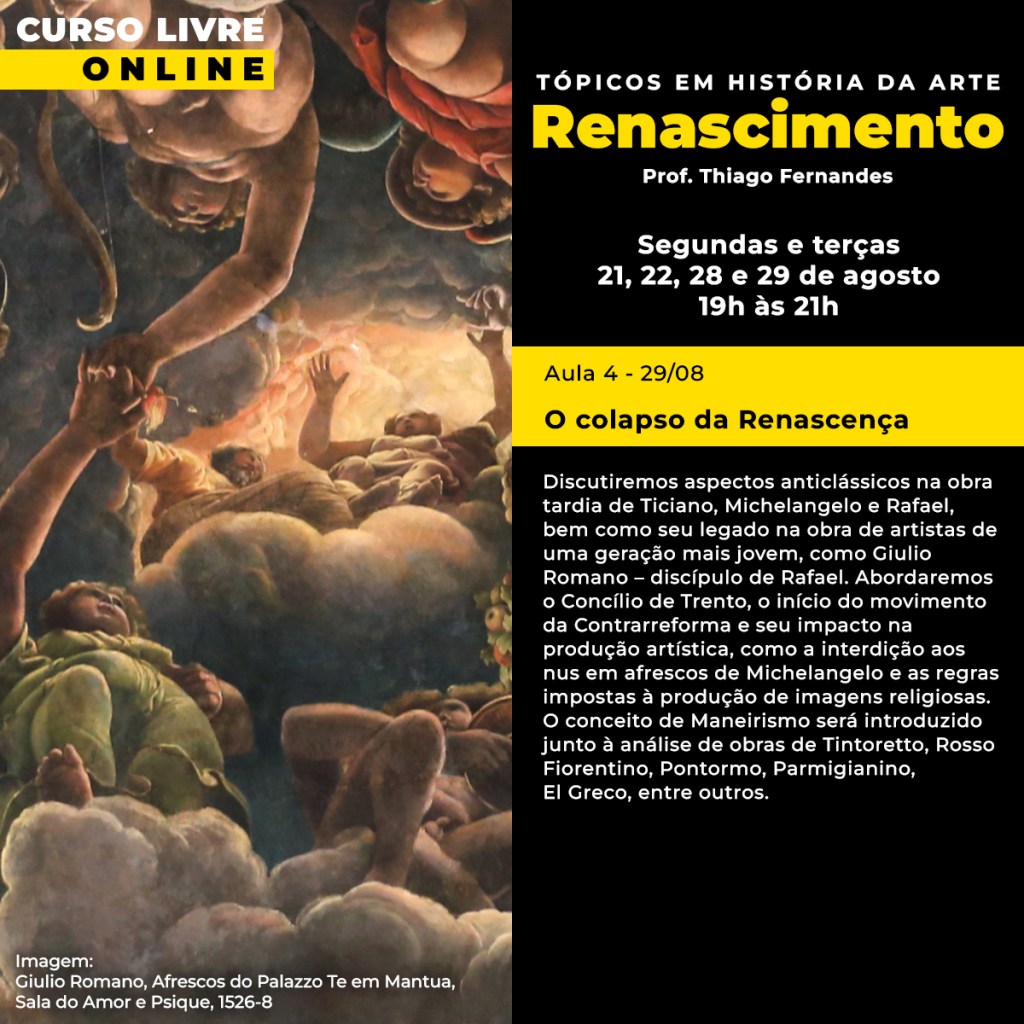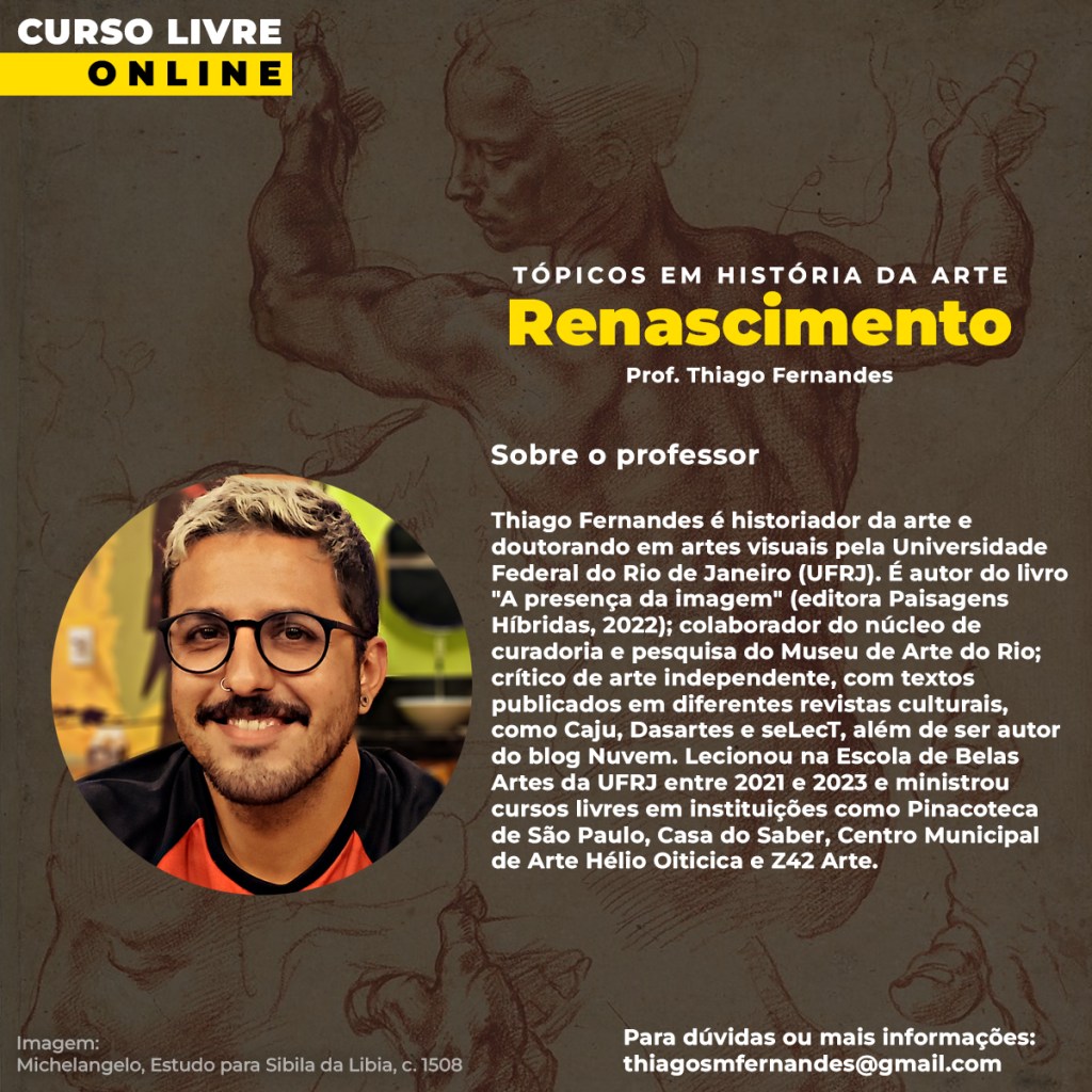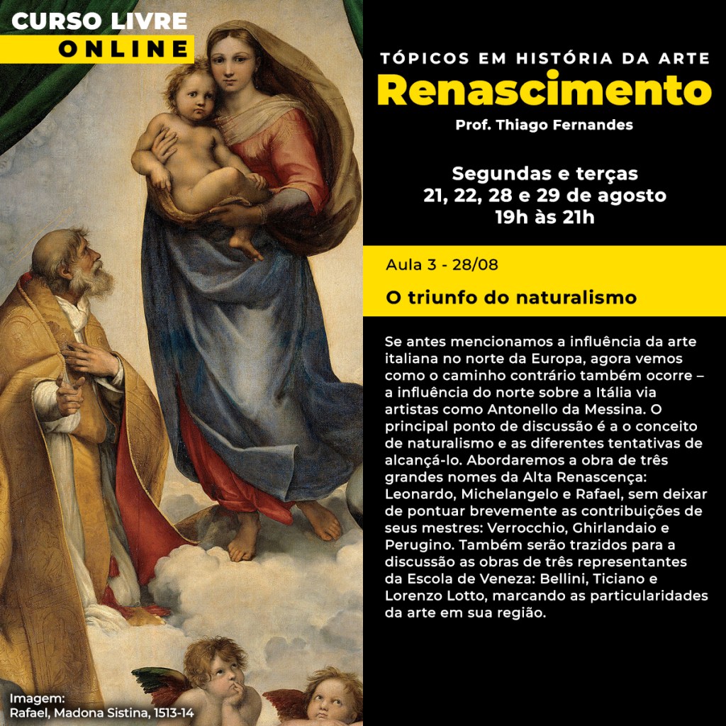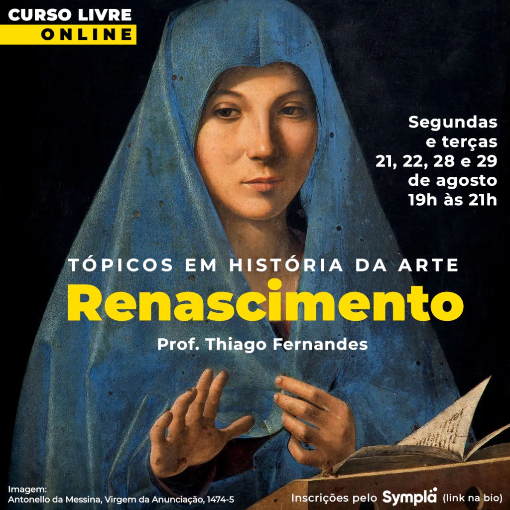 Aprofunde-se em um dos períodos mais fascinantes da história da arte ocidental. O curso apresentará alguns dos principais artistas do Renascimento, acompanhados por análises de suas obras, relacionando as transformações que ocorrem no campo da arte com o contexto social, político e religioso da época. Em 4 encontros online pela plataforma Zoom, com 2 horas de duração, vamos percorrer tópicos fundamentais para a compreensão desse período.