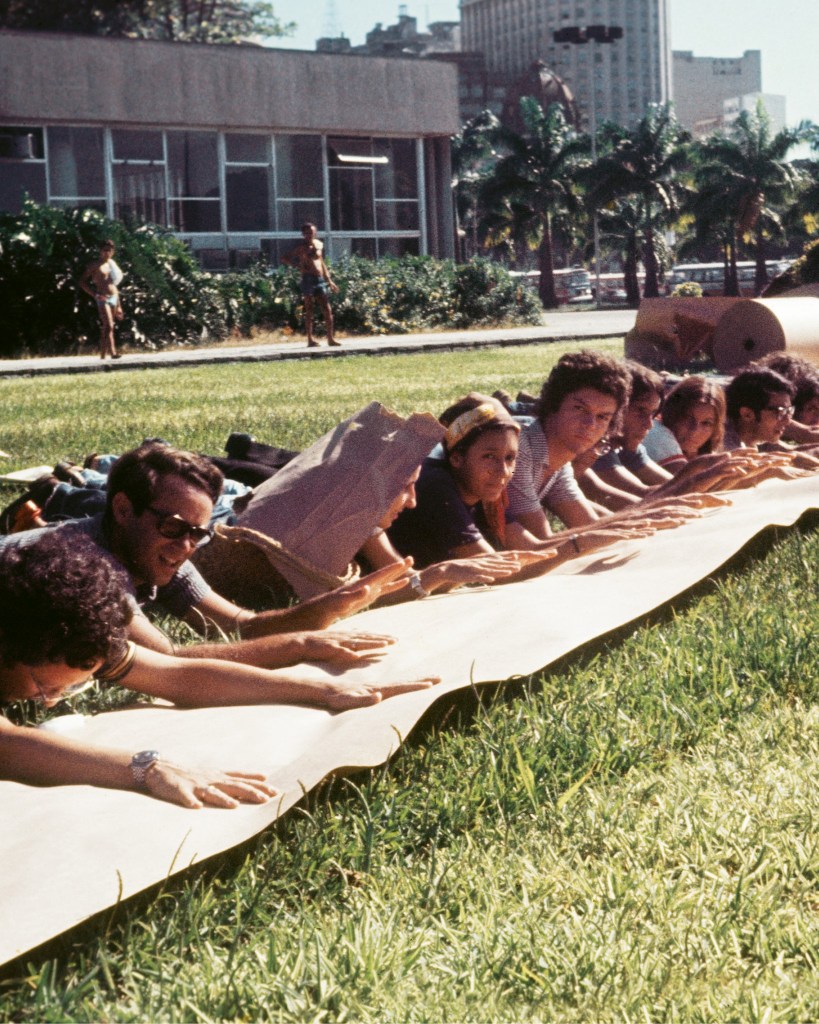 O mesmo caráter popular se evidenciara nos “Domingos da Criação” em 1971. A proposição de Frederico Morais consistia em uma série de manifestações criativas realizadas gratuitamente na área externa ao MAM-Rio ao longo de 1971 em 6 domingos: Um domingo de papel (24/01), O domingo por um fio (07/03), O tecido do domingo (28/03), Domingo terra a terra (25/04), O som do domingo (30/05) e O corpo a corpo do domingo (29/08). Cada edição propunha ao público experimentações criativas com um material/conceito diferente, entre eles o próprio corpo. Em seus escritos sobre os “Domingos da Criação”, Morais afirma ter como pressuposto a ideia de que qualquer sujeito, independentemente de sua origem, é inatamente criativo, e que a criação é um elemento essencial à vida cotidiana. O evento visava libertar em cada indivíduo sua própria criatividade e colocar em discussão a problemática do lazer em relação ao trabalho, uma vez que as estruturas empresariais e governamentais exploram não apenas a mais-valia do trabalhador, como também o lazer de seus fins de semana, que adquire formas burocráticas, repetitivas e alienantes. A proposição também apresenta a noção de sala de aula expandida (que pode ser qualquer lugar da cidade) e o estímulo da criação sem que isso signifique a posse da obra realizada. É o processo criativo que importa, mais do que o produto final (GOGAN; MORAIS, 2017).