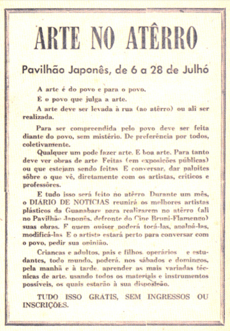 O evento “Arte no Aterro” abrangeu uma série de manifestações ao ar livre, aos sábados e domingos de todo o mês de julho de 1968, no Pavilhão Japonês do Aterro do Flamengo. Tratava-se de um evento de caráter essencialmente pedagógico e popular. No folheto de divulgação pode-se ler um programa que mais tarde encontraria ecos no “Plano-piloto da futura cidade lúdica”: “A arte é do povo e para o povo”; “A arte deve ser levada para a rua (ao aterro) e ali ser realizada”; “para ser compreendida pelo povo, deve ser feita diante do povo, sem mistério. De preferência por todos, coletivamente”; “Qualquer um pode fazer arte. E boa arte”. Na última linha do folheto, em caixa alta, lê-se: “TUDO ISSO GRÁTIS, SEM INGRESSOS OU INSCRIÇÕES”, o que ressalta a vontade de Morais tornar a arte acessível à população de baixa renda, objetivo também visado em seu curso gratuito oferecido aos domingos no MAM-Rio.